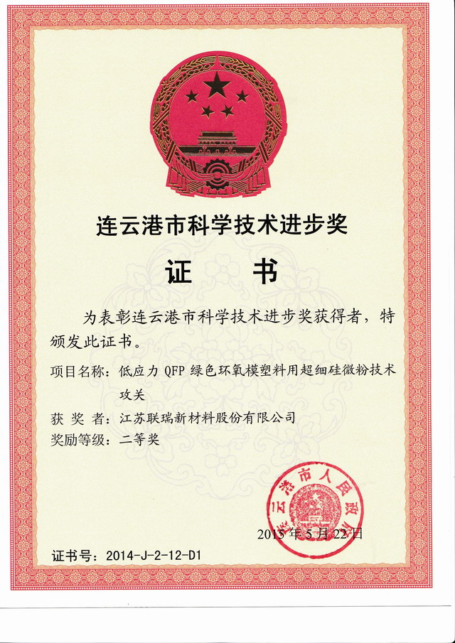 新聞中心 首頁>新聞中心>新聞中心 聯(lián)瑞新材榮獲“連云港市科技進步二等獎” 2015年05月30日 由江蘇聯(lián)瑞新材料股份有限公司承擔實施的“低應力QFP綠色環(huán)氧模塑料用超細硅微粉技術攻關項目”榮獲“連云港市科技進步二等獎”。